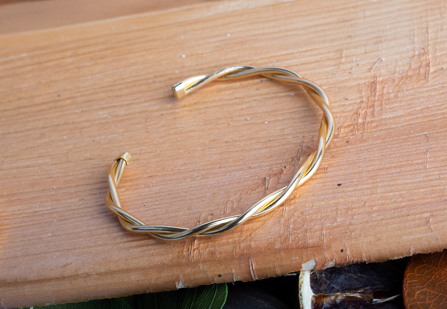 Bracelete dourado torcido no banho de 2 milessimos mais verniz.