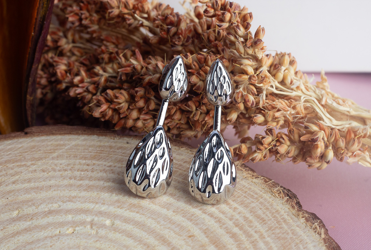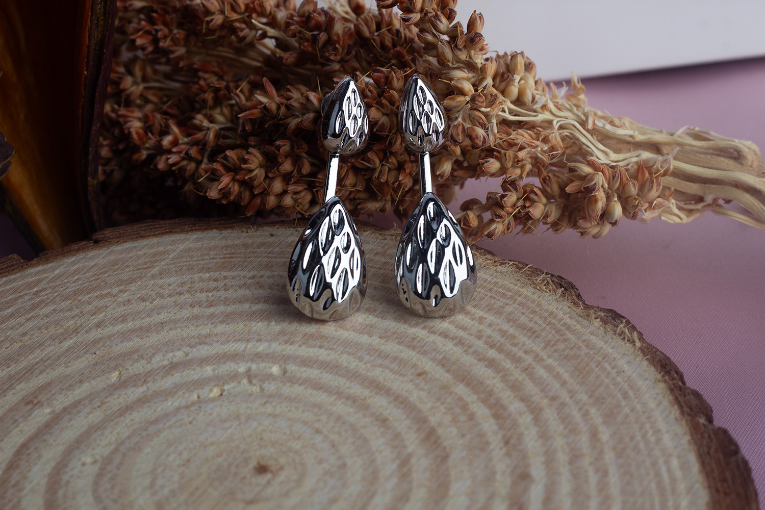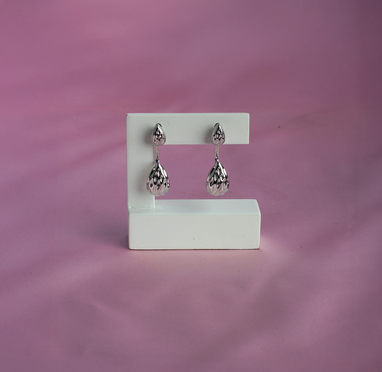 Brinco 2 em 1 gota martelada prata no banho niquel diamante.