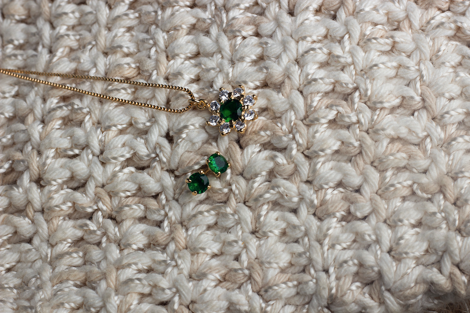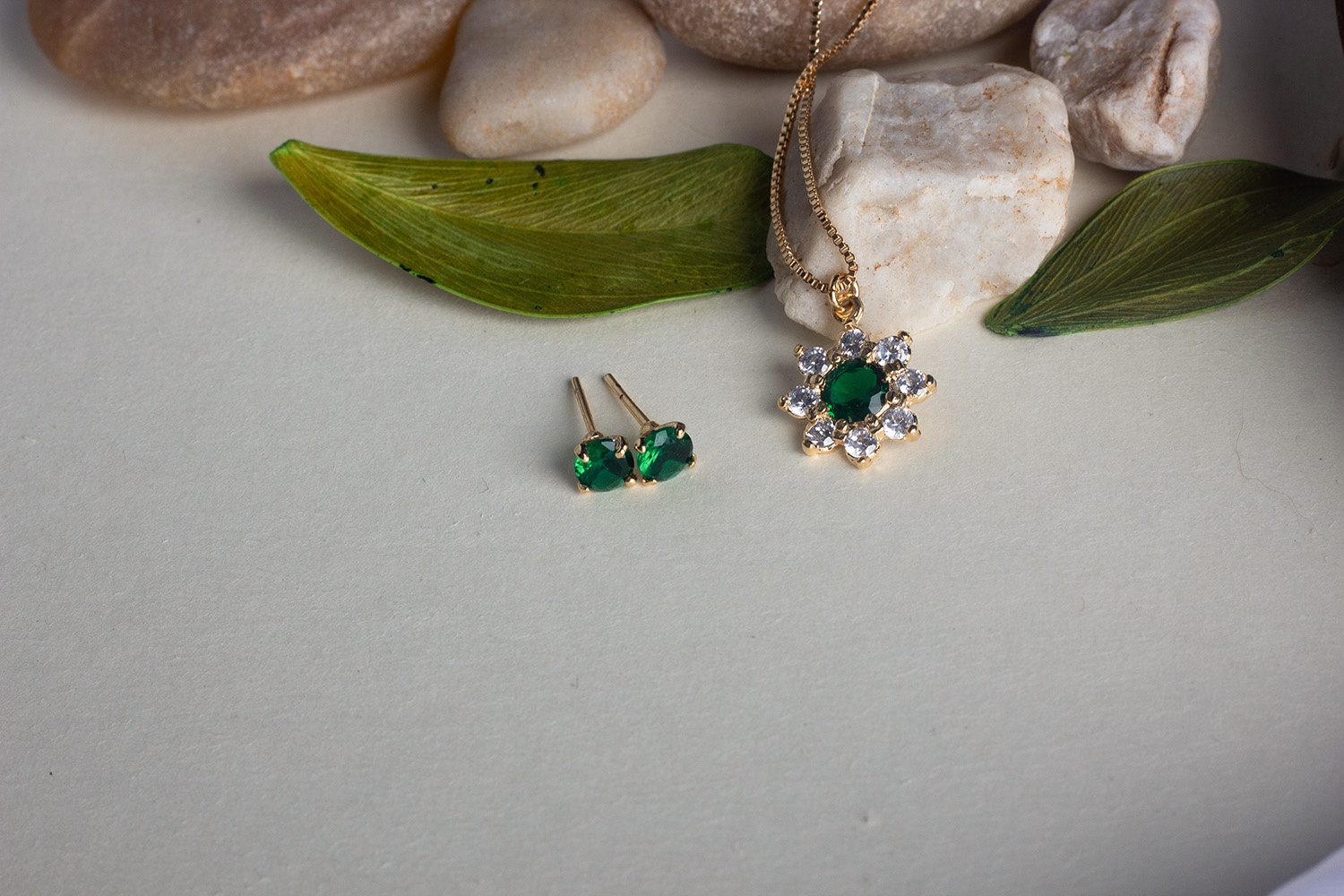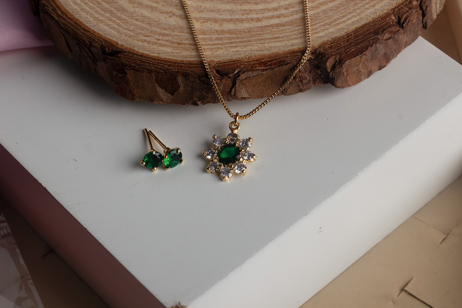 Conjunto dourado com pedras verdes e cristal no banho de 2 milessimos mais verniz.